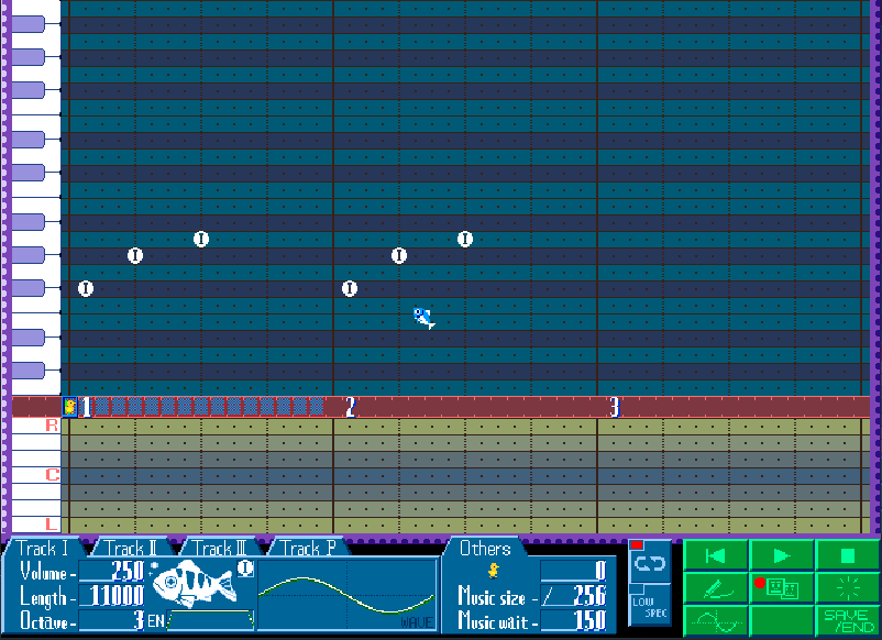 When you're finished with your sick tune, click the Save/End Button to save your PMD file. You can play it with the Piyo Piyo Player that comes within the program's folder. Open it and click the pendrive icon to load your PMD's.