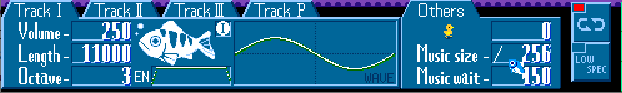 This is the main interface, and it where's the magic happens. You can switch between 3 different wave Tracks and one Drum track. But, aside from that, clicking in the values doesn't do anything, does it? We're almost there, don't worry. That little button with a red light is a Loop Function. Clicking the Low Spec switch bellow will blackout the GUI at playtime (which I assume was intended for... runtime problems?).