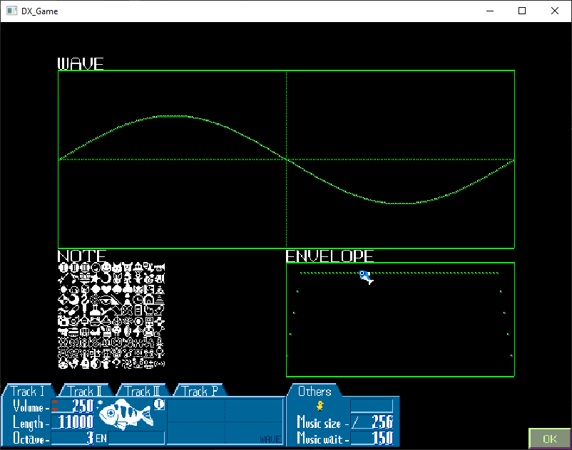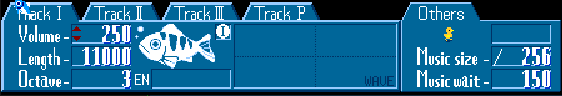 Use the Arrow Keys (Up and Down) to set the values such as the song's Volume and the wave's Length and Octave. Music Size defines the end point of your track, while Music Wait sets the Tempo. The higher it is, the slower is your music.