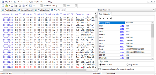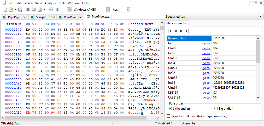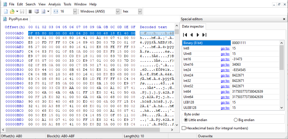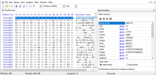 With all instaled, open HxD (or the program of your choice), go to > File > Open, and then load Piyo Piyo. It will load all its HEX data, so now we can edit it and fix the booting problem.