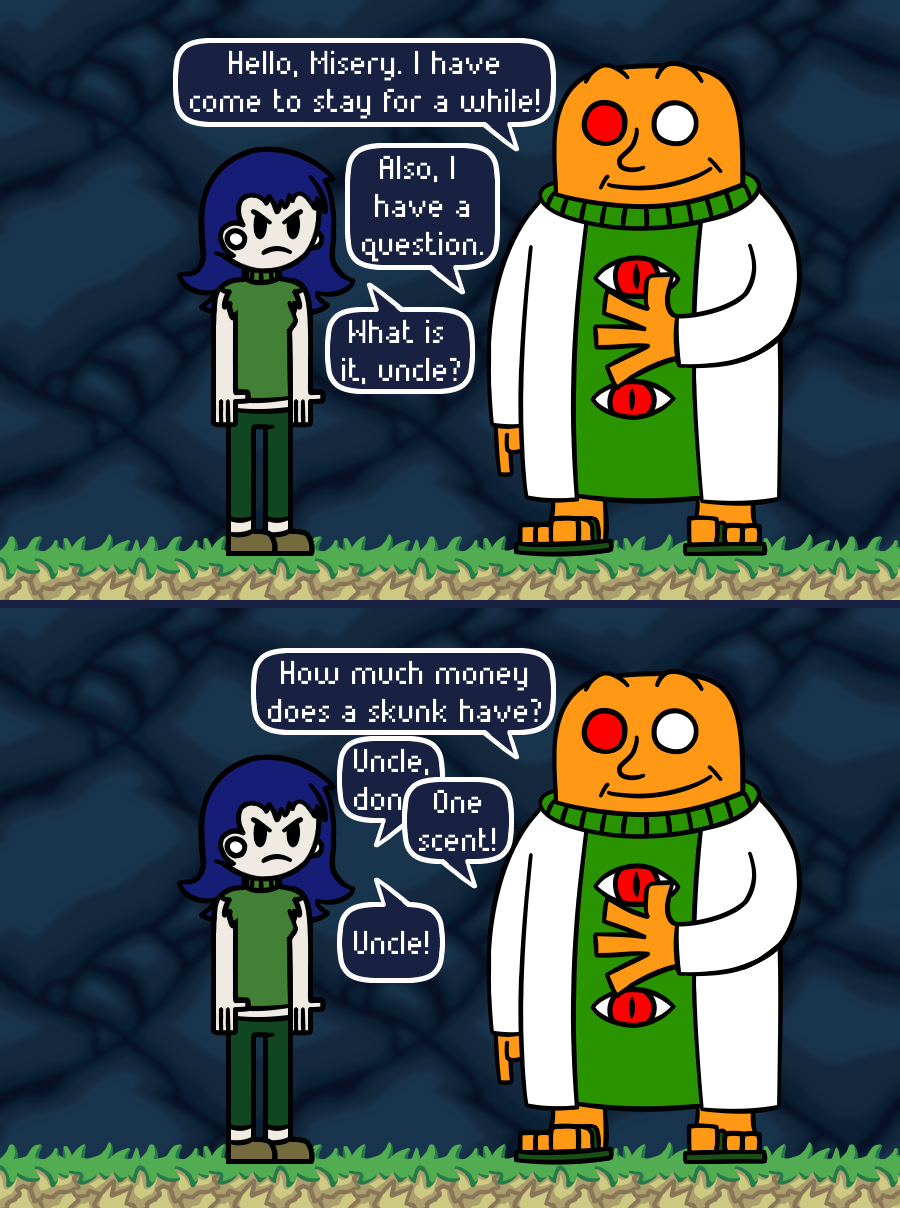I haven't made a comic in a couple weeks, and I've decided that I'm not going to make another one for a while. I'm going to make other things, and I have an idea for a comic so keep checking The Last Resort for updates. Thank you for reading.