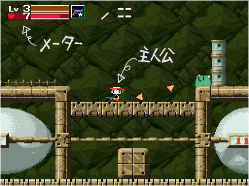 赤のメーターが主人公の体力。なくなるとゲームオーバーになります。