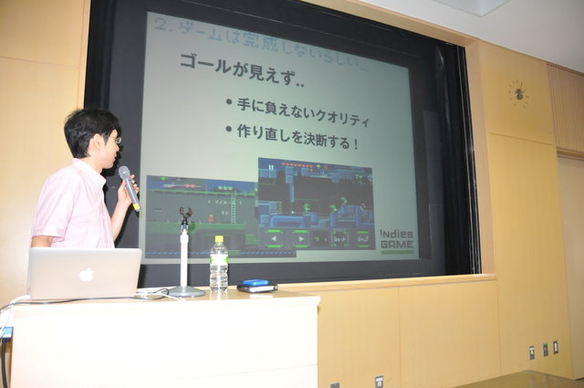 さらに、そもそもインディーであることを前提に完成できるものを創るべしとも強調。端的に「FFやDQは創れない」と表現しました。ただし、ネガティブに捉えるのではなく、表現力が限られるならばその領域内でプレイヤーの想像力をかき立てるものに仕上げるなど、しかるべきアプローチがあるということです。逆に、たとえば小説が映画化された際の読者のイメージと映像化の落差を引き合いに、必ずしも表現力が低いことがハンディキャップになるとは限らないともしました。