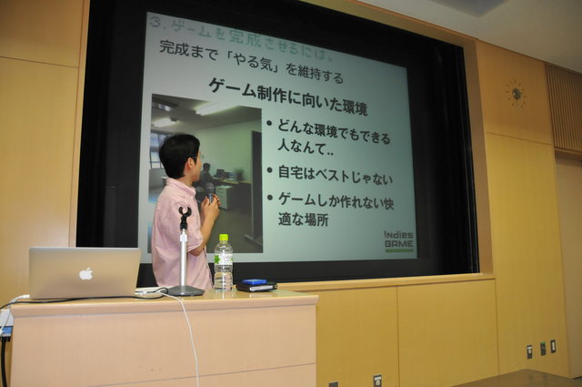 最後に、モチベーションの問題について。第2回でも発言があったとおり、自宅で各種誘惑に曝露しながら製作するのではなく、インキュベーション施設などしかるべき環境を整えるべきであると改めて強調しました。最初は喫茶店を利用していて、それはそれで効果的だったものの、やはり周囲の雑音が気になり、最終的に現状に至ったとのことです。インキュベーション施設の最大のメリットは「他に仕事をしている人がいること」。会社のような緊張感を維持しながらもプレッシャーから解放されることは有効だそうです。