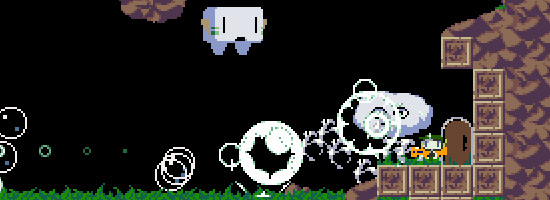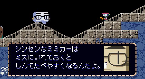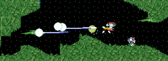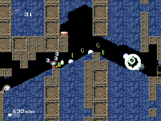 武器の種類もかなり多く、どちらかと言うと武器の使い分けで進んでいくというパズル的要素のほうが強かった(順序良く壁を壊して登る、狙いを付けて隙間から攻撃する等)。シビアでシュールなセリフが多いのも特徴。リリースされた洞窟物語との主な相違点は以下の通り。