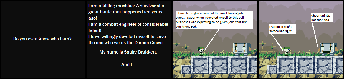 Useless trivia: Squire Brakkett is a corruption of "square bracket," going with Cave Story's theme of naming the robot protagonists after punctuation marks.