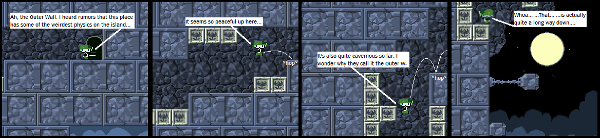 Squire's comment in Panel 1 is based on the fact that items are gravitationally attracted to the side of the island (That, and it's perpetually night on the Outer Wall.)