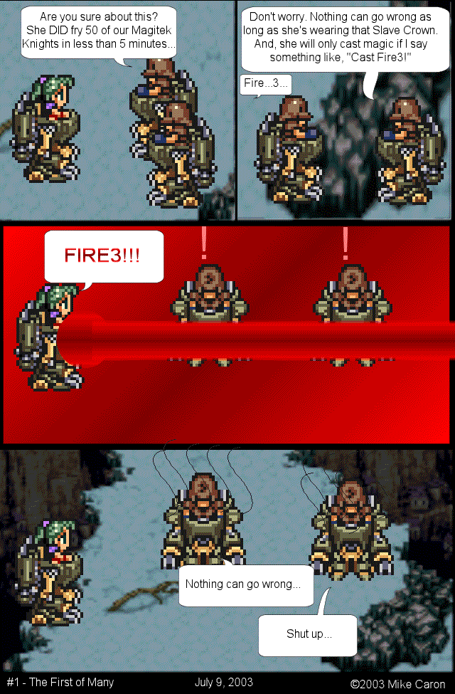 Set the way-back machine to early 2003. I was in grade 10 at the time, and I had a great idea for this great comic. I'd been reading 8-Bit Theater at the time (which, at that point, was itself only a few years old), and so my comic idea was based on Final Fantasy. Not Final Fantasy I, as Mr. Clevenger did, but Final Fantasy VI. I called it Final Fantasy Q. (No, I still don't know what the Q was supposed to be. I just thought it was funny)