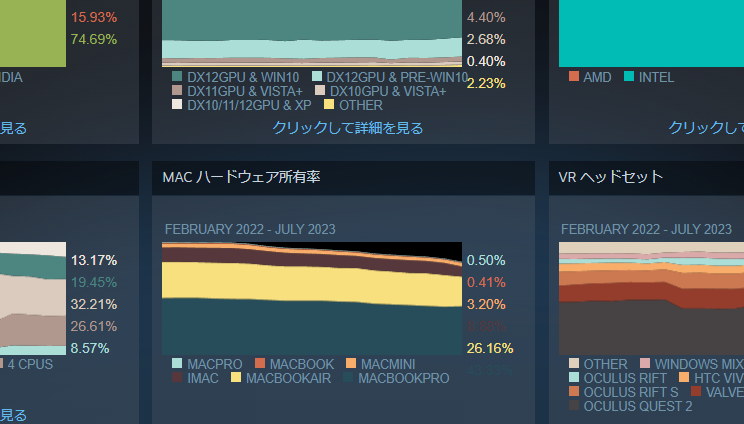 Steam ユーザーのマシンの性能調査(2023-7月)。自分のゲームにとって対応が苦しい高い解像度は10%くらい。4K は 4%弱。まだしばらくは 1080p が主流ぽい。 #gamedev