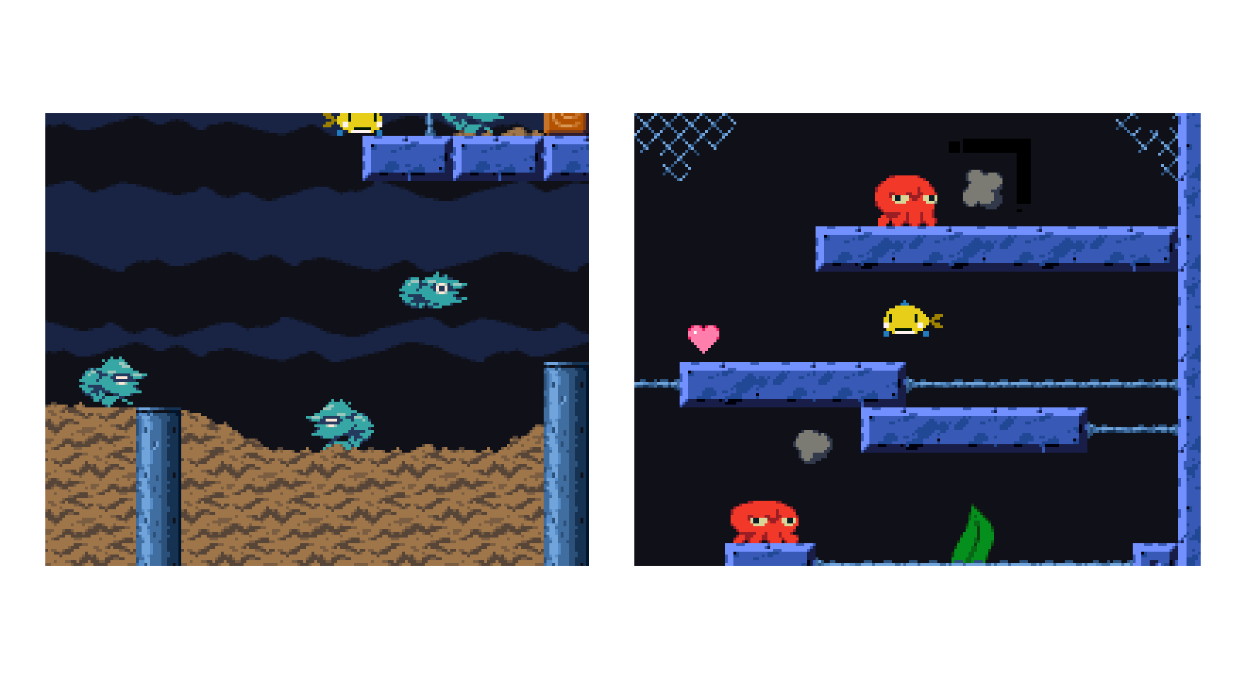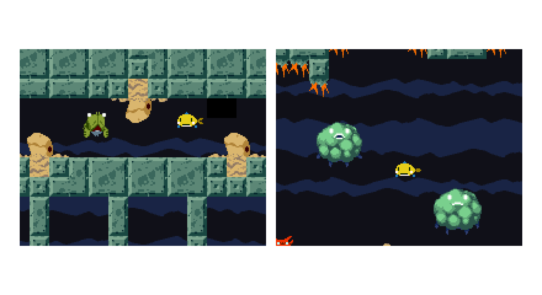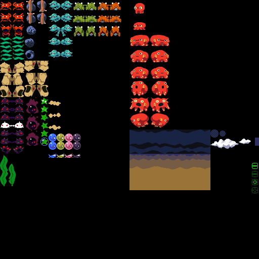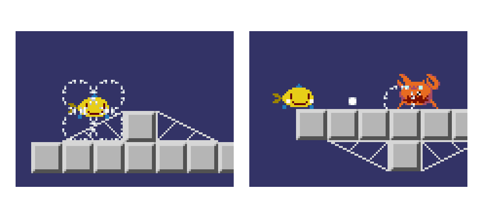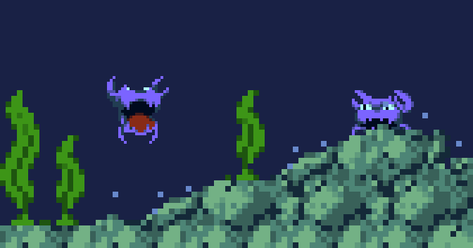 寝ているエビ🦐ダメージで逃げ出す。スミを投げてくるタコ🐙移動はしない。 #gamedev #ゲーム制作
