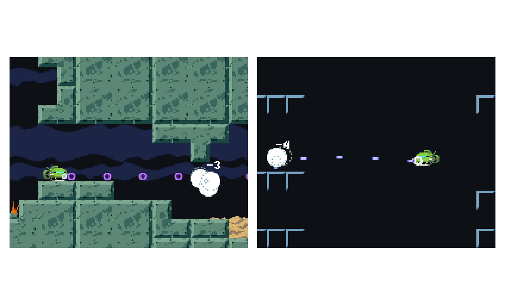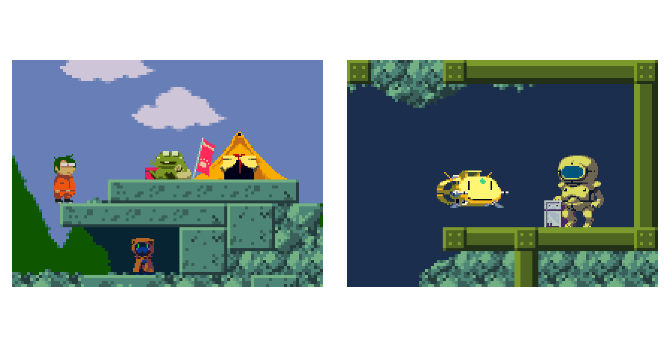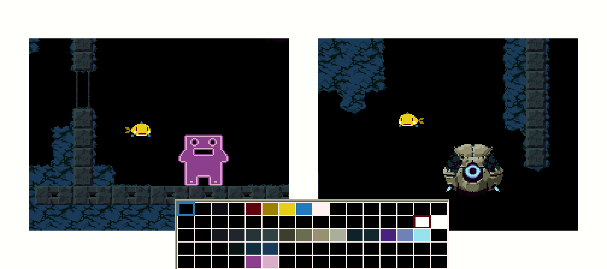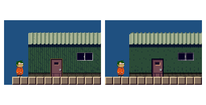 背景だけ解像度を半分にする暴挙。緻密なのよりこっち(右)が好きだな。描く量が1/4になるのも嬉しい😋 #gamedev #ゲーム制作