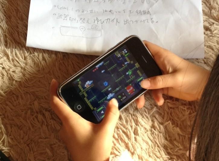 制作中のゲーム、初見者向け調整ができてきたので、ずっとプレイを我慢してもらってた子供が初プレイ中。今のところ好調(^^) #iPhoneゲーム開発