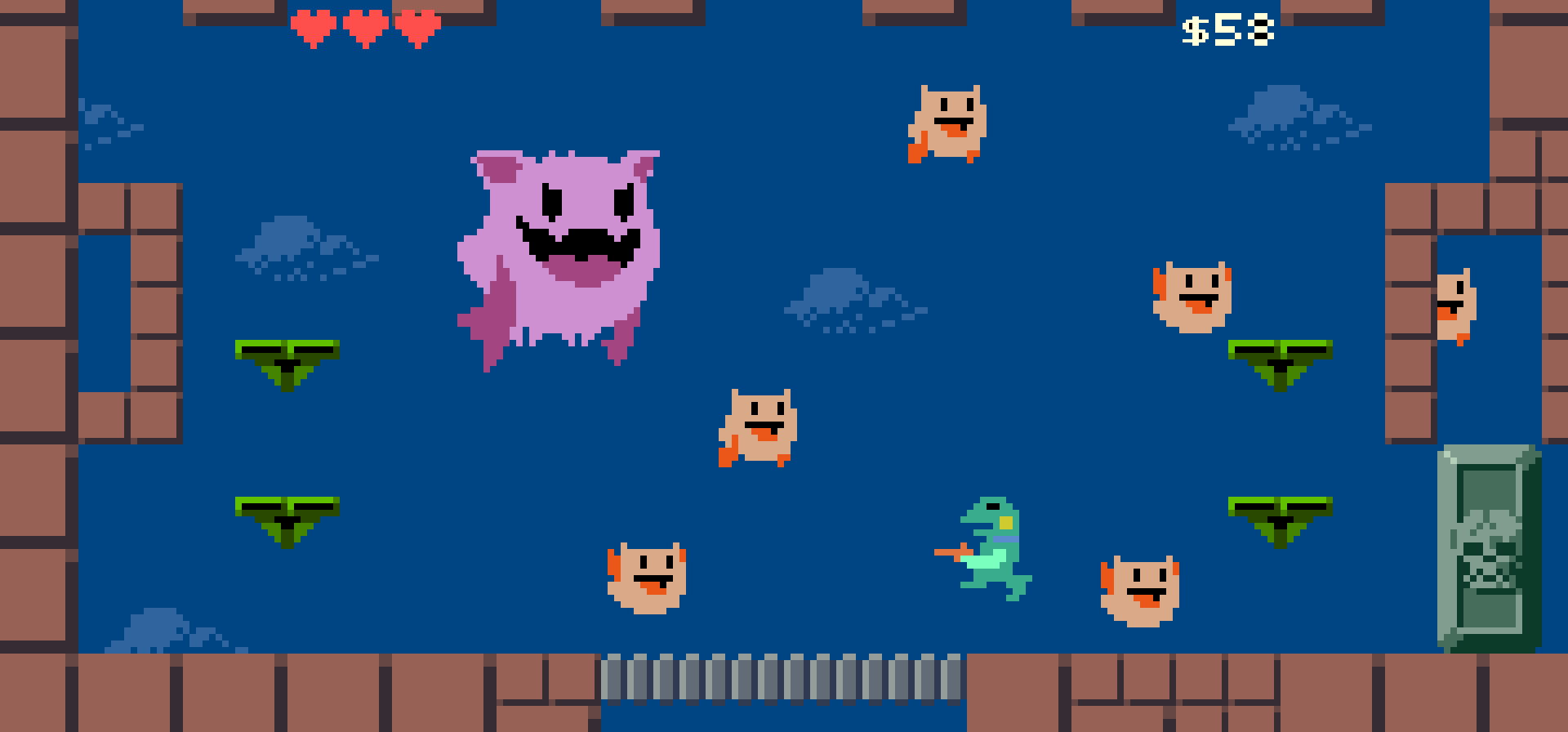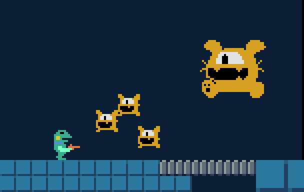 小さい門を守る敵キャラ。バネの体でジャンプしながら上段と下段に分けて弾を撃つ。 #gamedev