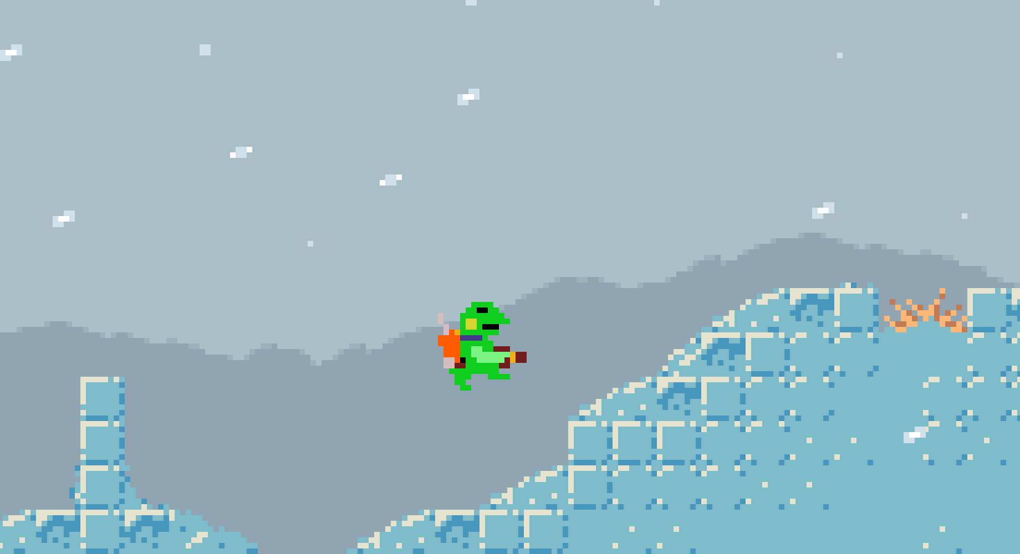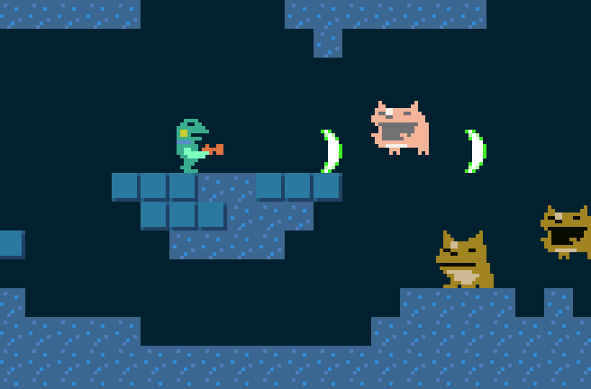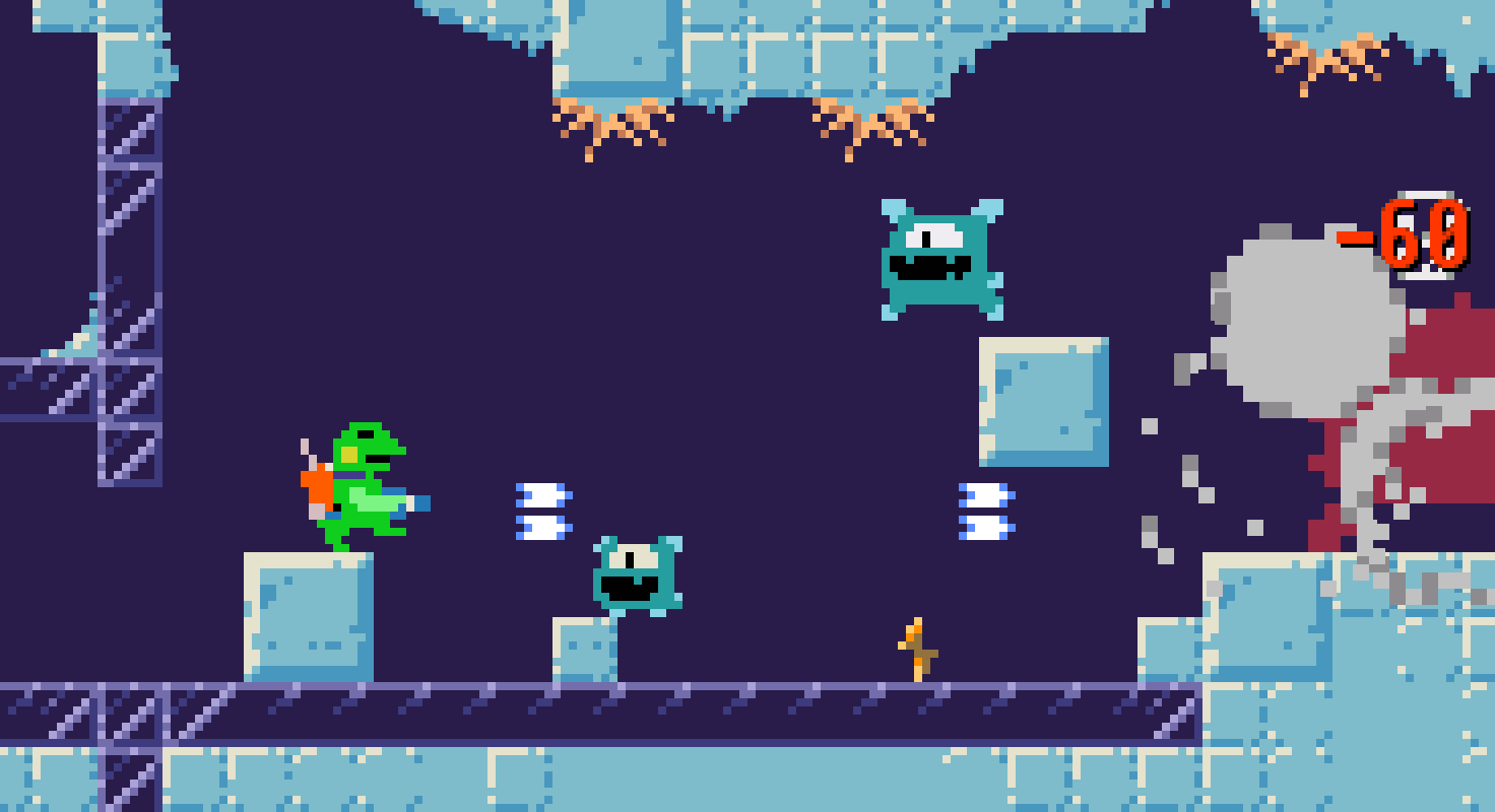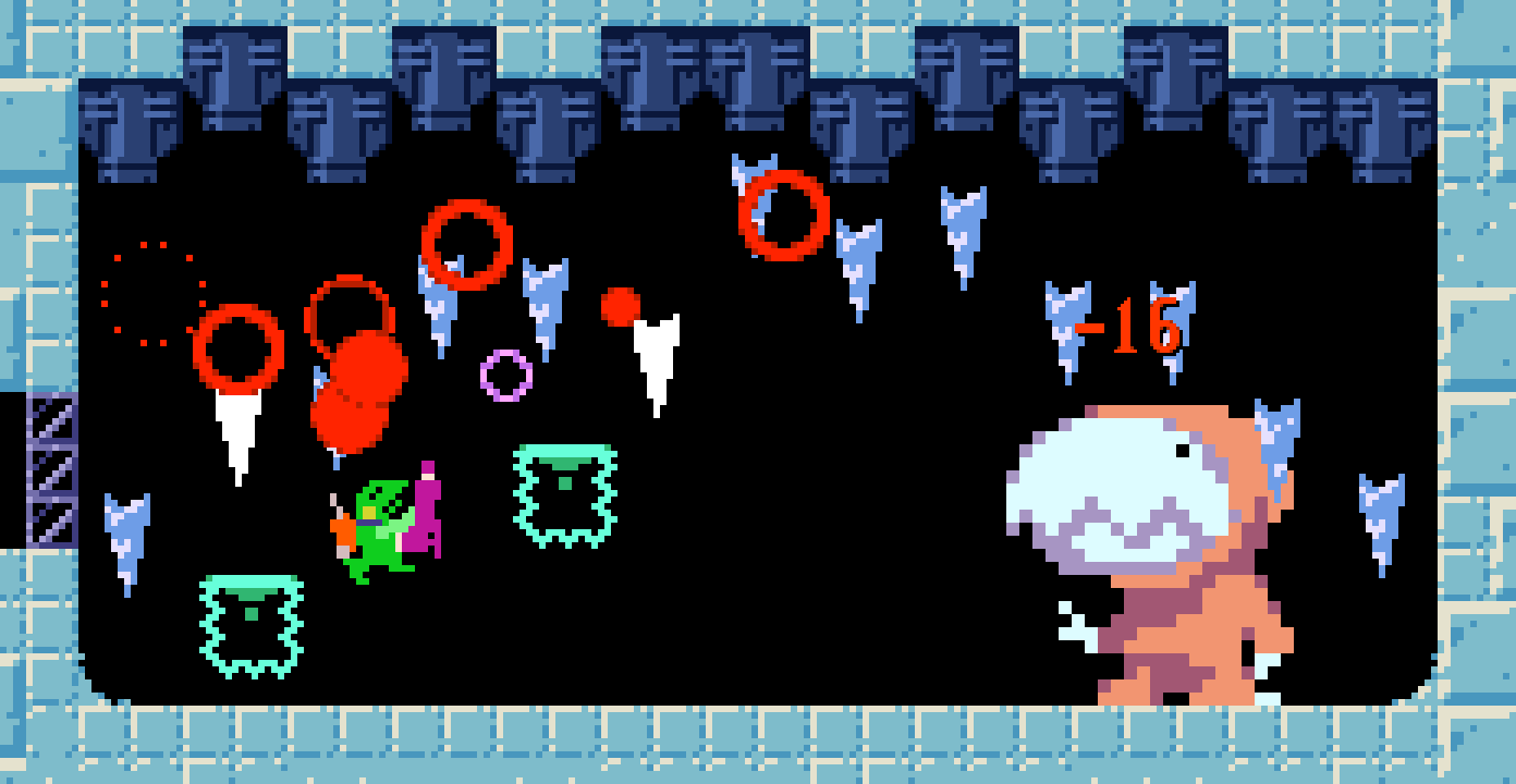 残りの2つのUFOは、氷山と巨大な海獣の方角へ分かれたのでとりあえず氷山に向かう。氷の洞窟は敵も味方もツルツル滑る床。(注:ケロブラスターではありません) #gamedev #開発中止🫠