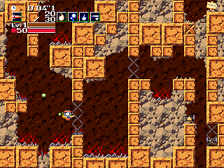 開始早々、大量の即死トラップが敷き詰められているが、画面をよく見ると、2マス分の即死トラップの他に、1マス分のダメージ5の針があるのがわかる。アクションが苦手なら、そこで一度着地してしまえばいい。が、慣れてしまえばなんてことなくノーダメージで通過できる。ブースター弱噴射3〜4回で階段状の地形を越え、そのあとは右にキーを入れつつ右噴射→上噴射で、次の足場に到達できる。