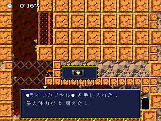 着地した位置にライフカプセル。ここでライフが最大の55となる。ちなみに、ワタシはこのカプセルを武器エネルギー同様撃って壊すものとず〜っと勘違いし続けていて、しばらくの間タイムアタックをライフ50で行っていたorz