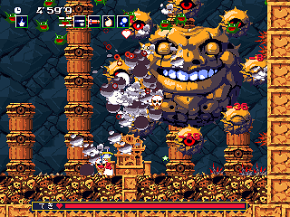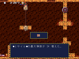 タイムアタックのパターンが煮詰まってきたら、ここで余裕がある分のミサイルを撃ち込むのもいい。あくまでも、次の戦闘で必要な量以上は使ってはいけないが。ヘヴィプレスを倒したあと、少し間をおいてヘヴィプレスは下に落ちる。この時、これに潰されるもしくは落下しているヘヴィプレスに横から触れると即死するので要注意。落ちるまでは絶対に近づかないように。