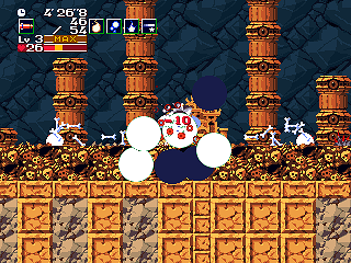 自機に向かって体当たりしてくる。上下左右どの方向にも移動してきて、4回の移動ののち地面(もしくは天井)に着地、その際に衝撃波と骨が発生する。